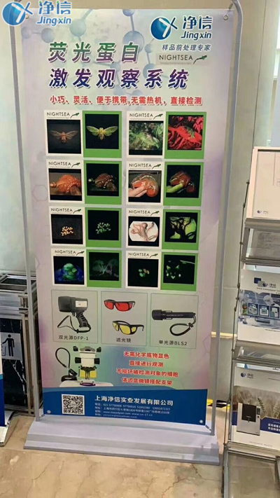 同時,在此次展會上,上海凈信還推出了一款沉淀已久的新產品—美國NightSea熒光蛋白激發觀察系統,這是一款無需化學底物顯色,直接進行觀測,不損壞被檢測對象細胞的設備,擁有小巧、靈活、易攜帶、使用簡便等優點,對于有轉基因實驗需求的科研人員,是一種特別“對胃口”的產品;其原理是發出的特種光源照射至生物表面時,佩戴專用濾光鏡(過濾掉大部分反射光只保留所需要的光源);便可實時觀察生物的基因變化狀態,目前分為單光源和雙光源兩種型號。